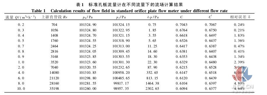 在已知qV的前提下,可以通过CFD数值模拟得出孔板前后D和D/2截面上的压力差△p,然后将qV、△p代入式(2),求出数值模拟流出系数C′。
