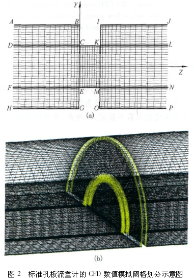 为了准确捕捉孔板前后流场的变化情况,以上、下游直管段内与孔板等孔径的圆柱面为分界面实施Split操作(图2(a)中所示为线段DC、FE、KL、MN),并将边界层作为一种网格加密的技巧在此予以应用:分界圆柱端面向外、向内边界层的行百分比选用15%,共10层,比例设为1.1;分别将圆环面和半圆面以Map、Pave的方式进行网格划分。上游直管段的轴向网格密度沿BA、CD、EF、GH方向以1.1的比例由密变疏,下游直管段的轴向网格密度沿IJ、KL、MN、OP方向以1.1的比例由密变疏,孔板轴线方向(CK、EM)上的网格平均分布。***后采用Cooper进行网格划分,***终所得网格划分情况如图2(b)所示。